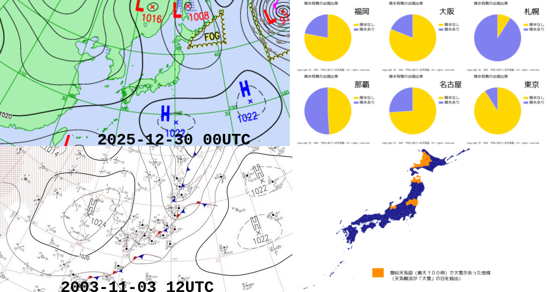 明日9時予想天気図の類似天気図を 456例抽出しました(うち上位100例中、