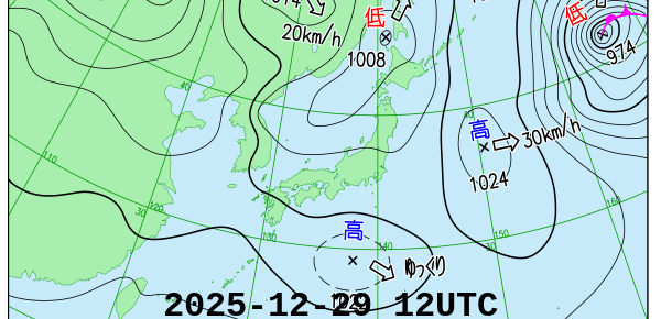 今日の天気図と似ている天気図の日を調べています。似ている度合の判断は気圧場の相関係数に依っています。気象庁が発表する天気図に合わせて毎日6時間毎に内容を更新しています。